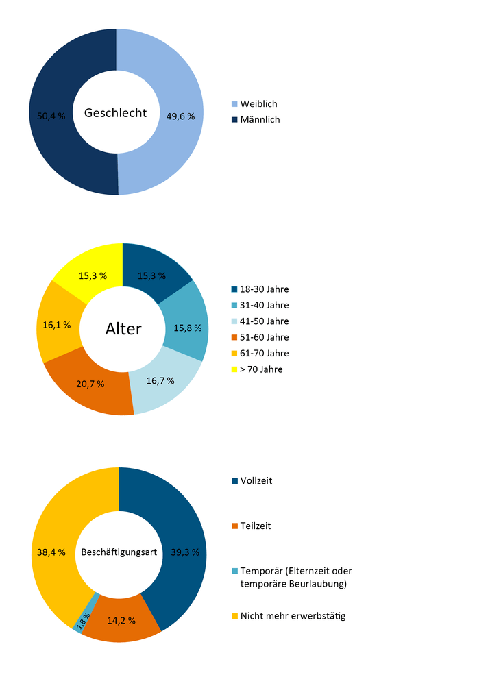 6,3 Prozent (63) sind beruflich selbstständig, 39,3 Prozent (395) sind in Vollzeit und 14,2 Prozent (143) in Teilzeit angestellt, 1,8 Prozent (18) sind temporär (Elternzeit oder temporärer Beurlaubung) und 38,4 Prozent (386) langfristig nicht oder nicht mehr erwerbstätig.